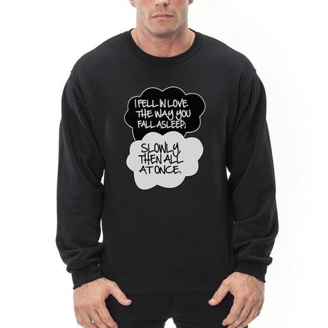 "I Fell In Love" John Green Quote from The Fault in Our Stars Crew Neck Sweatshirt. Our deluxe crew neck sweatshirts are perfect for keeping warm in the cold weather. Each sweatshirt is stylish and super comfortable! Crew neck sweatshirts are great for wearing under a jacket or zip up hoodie to keep warm when it's cold and since the garment is made of breathable cotton-poly fabric these sweatshirts keep you from over heating when things get hot! Each crew neck sweatshirt is perfect for men and women. These sweatshirts are great for work, athletic training and daily wear.