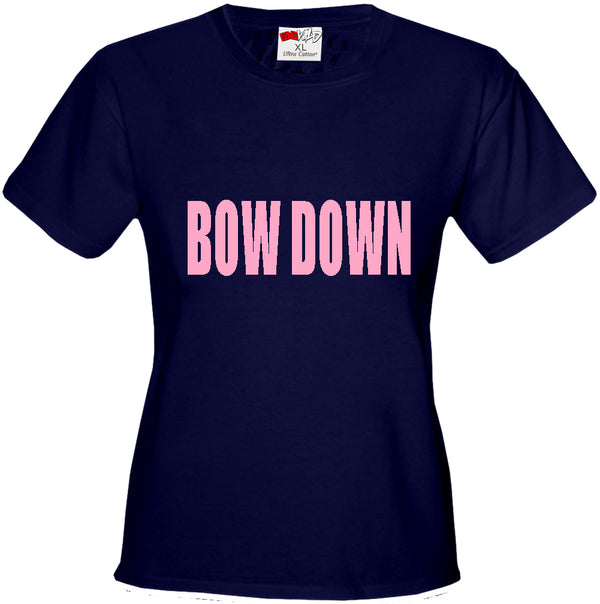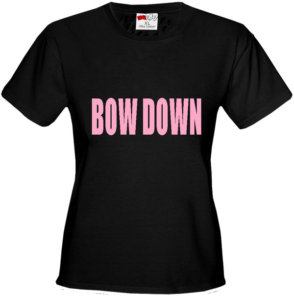 BOW DOWN Junior Fitted shirts are a S-32" at bust and 29" at waist, M-34" at bust and 30" at waist , L36" at bust and 34" at waist, XL-38"...