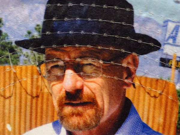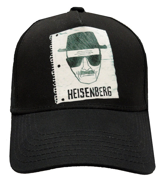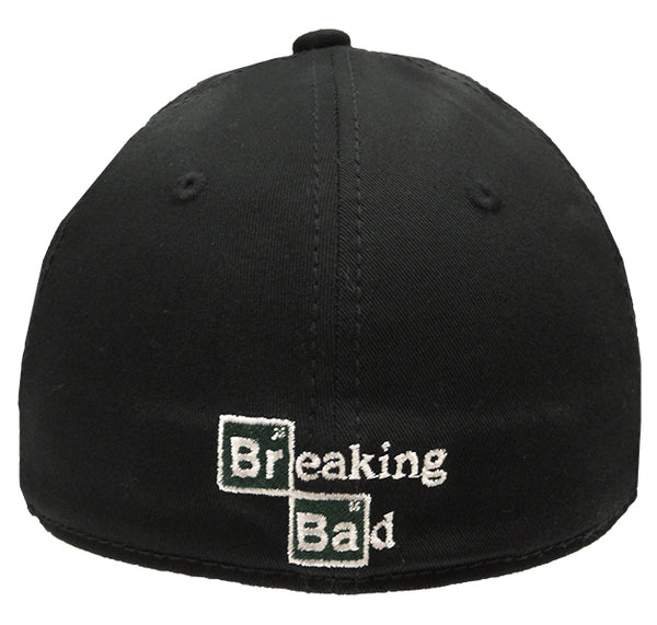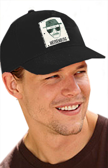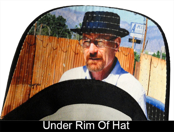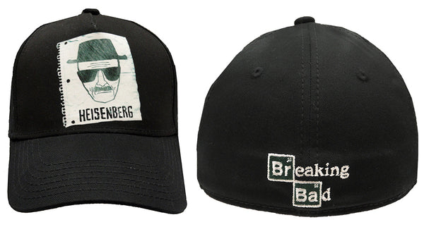 AMCs Breaking Bad Baseball Hat features Heisenberg on the front with a color image of Heisenberg under the rim of the hat.