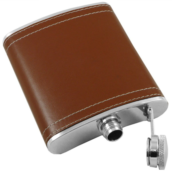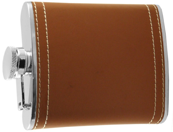 Brown Leather Wrap Hip Flask. The Accent Stitched pocket flask is made of 100% stainless steel and is finished with professionally fitted brown leather sheathing with white stitched accents. This...