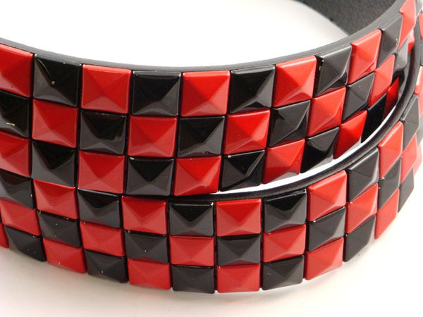 Genuine Leather Belt With Red & Black Pyramid Studs. Our special leather Pyramid studded belts are far superior in style than a plain black belt. Liven up your out fit...
