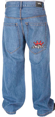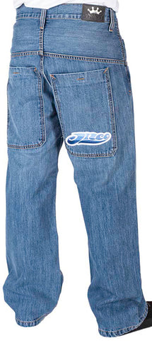 Jnco Designer Jeans are here! These jeans are premium quality vintage Denim made of 100% Cotton in the USA. Jnco has been a staple brand of streetwear for over two decades, and they are back once again in modern style. Each pair is meticulously hand made in America by artisans who helped build the designer Jean trend from the very beginning. Jnco premium denim is rinse washed with a soft vintage feel. Rear pocket embroidery stays true to Jnco's roots. Each pair features a standard 32" inseam and a boot cut leg. Defy conventional jeans, Demand Jnco. The American Premium Denim Brand.
