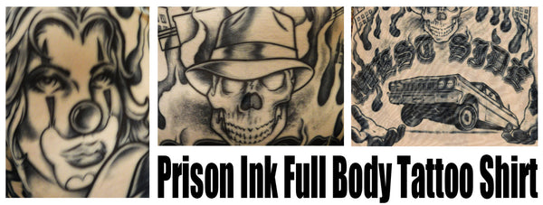 Prison Ink Full Body Tattoo Shirt. This Prison Ink Full Body Tattoo Shirt emulates a real full body tattoo. It features different prison style tattoo designs all over it. This...