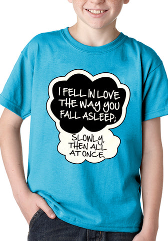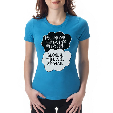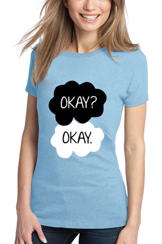 "Okay? Okay." John Green Quote The Fault in Our Stars Infinity Symbol Junior Fitted shirts are a S-32" at bust and 29" at waist, M-34" at bust and 30" at waist , L36" at bust and 34" at waist, XL-38" at bust and 35" at waist.
