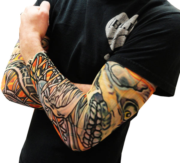 Tattoo Sleeves - Skull And Flames Biker Fake Tattoo Sleeves (Pair).Hot new amazing item, temporary slip on body art. Amaze your boss, your wife, your friends with our new temporary...