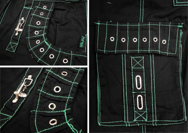 All Sales Final Tripp NYC "Serpent" Bondage Pants. These pants have it all, Black Straps,chrome zippers, and hot grommet accents and jet black material with toxic serpant green contrast stitching!...
