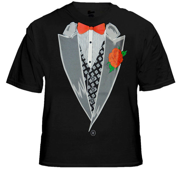 Deluxe Showman's Tuxedo T-Shirt with Vest & Bowtie. This deluxe tuxedo t-shirt feature beautiful shading that makes this Tuxedo tee stand apart in the crowd. The simple fine line design...